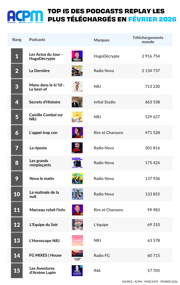 En février, un total de 31,4 millions de téléchargements a été enregistré sur l’ensemble des 790 podcasts certifiés, soit une évolution de 3 % à périmètre constant (vs février 2025), confirmant la forte dynamique et l’engagement des audiences autour de ces contenus.