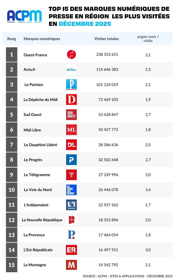 Retrouvez l’ensemble des chiffres des 262 marques médias numériques adhérentes à l’ACPM en cliquant sur le lien ci-dessous :