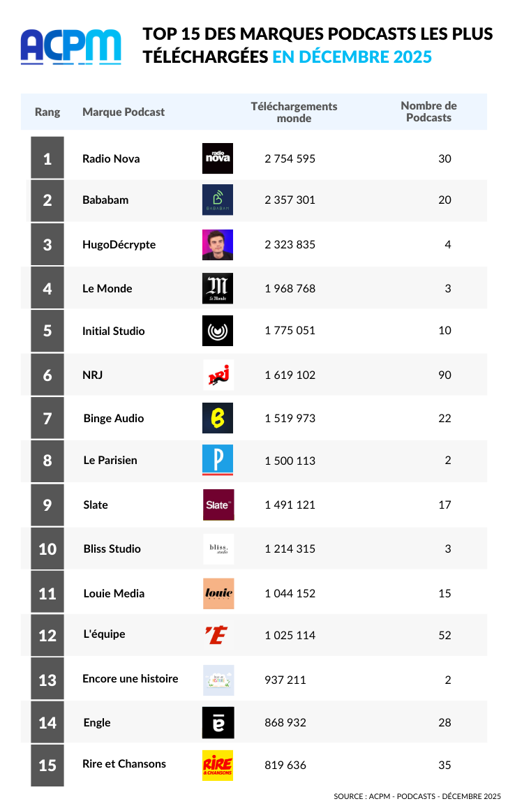 En décembre, l’ensemble des 795 podcasts certifiés totalise 30 millions de téléchargements dans le monde, soit une hausse de 4 % à périmètre constant par rapport à décembre 2024.