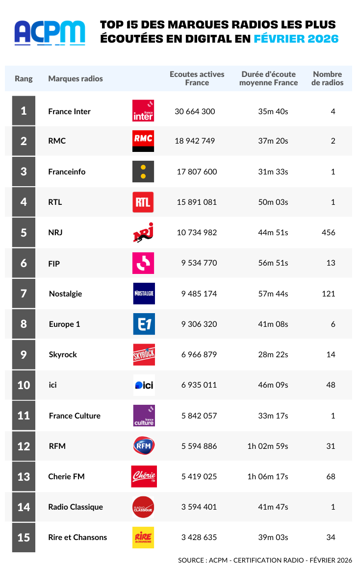 Ce mois-ci, parmi les nouvelles radios, l'ACPM accueille dans son classement : Mon tout petit France Inter, Group RCI