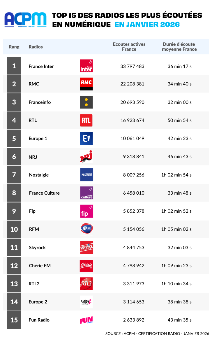 Ce mois-ci, parmi les nouvelles radios, l'ACPM accueille dans son classement : RCI Guadeloupe, RCI Martinique, Bel Radio, M40, Mixx One, Ici 100% Années 80