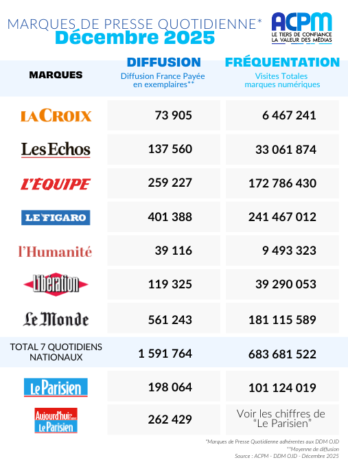 L’ACPM a le plaisir de publier les chiffres, du mois de décembre, de la diffusion et de la fréquentation des Quotidiens (Marques de Presse Quotidienne adhérentes aux D.D.M. OJD).