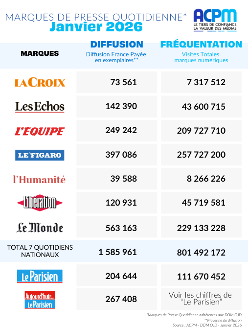 L’ACPM a le plaisir de publier les chiffres, du mois de janvier, de la diffusion et de la fréquentation des Quotidiens (Marques de Presse Quotidienne adhérentes aux D.D.M. OJD).