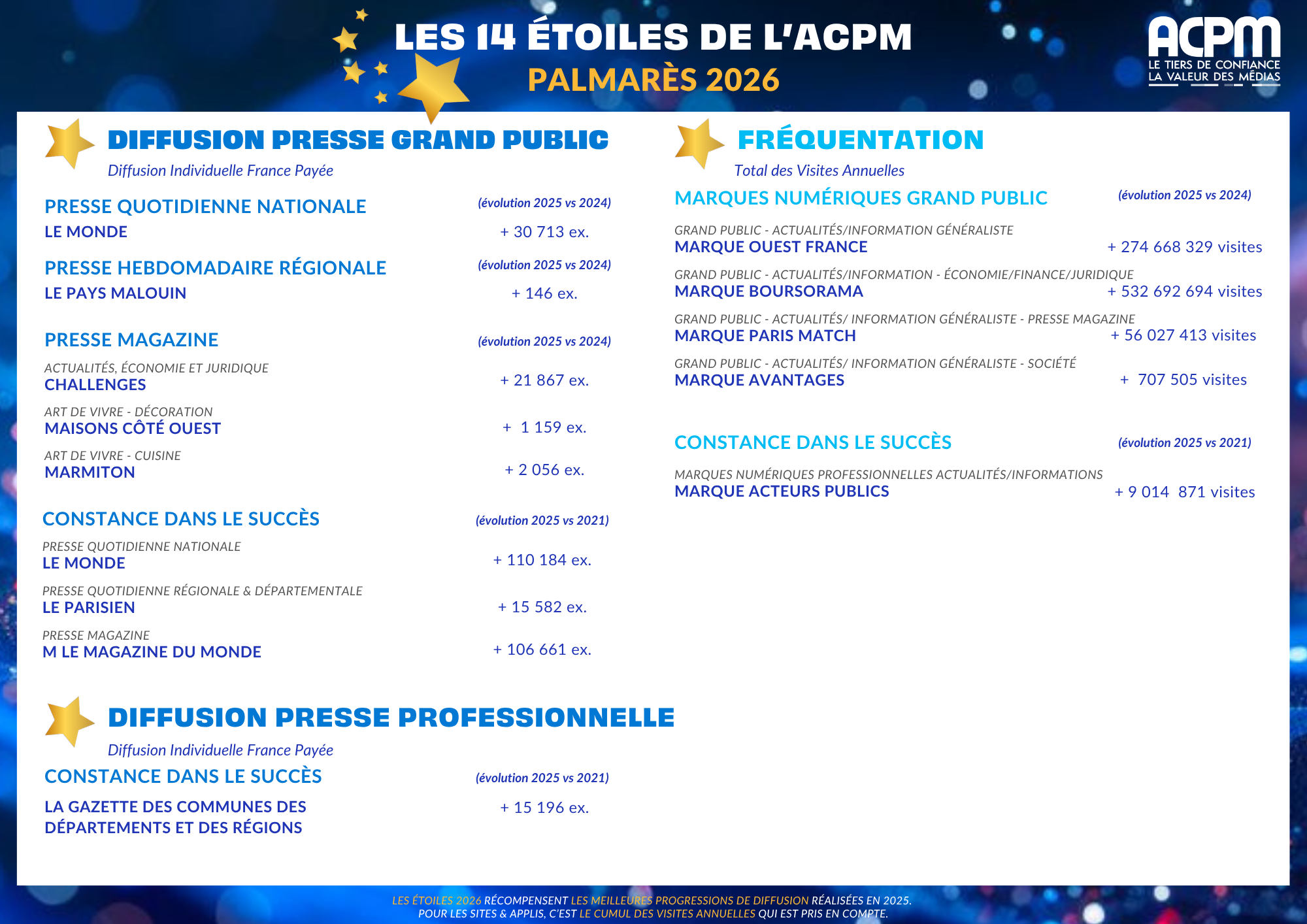 Il s’agit des 14 titres et marques numériques ayant enregistré les plus fortes progressions de leur diffusion presse et de leur fréquentation internet en 2025.