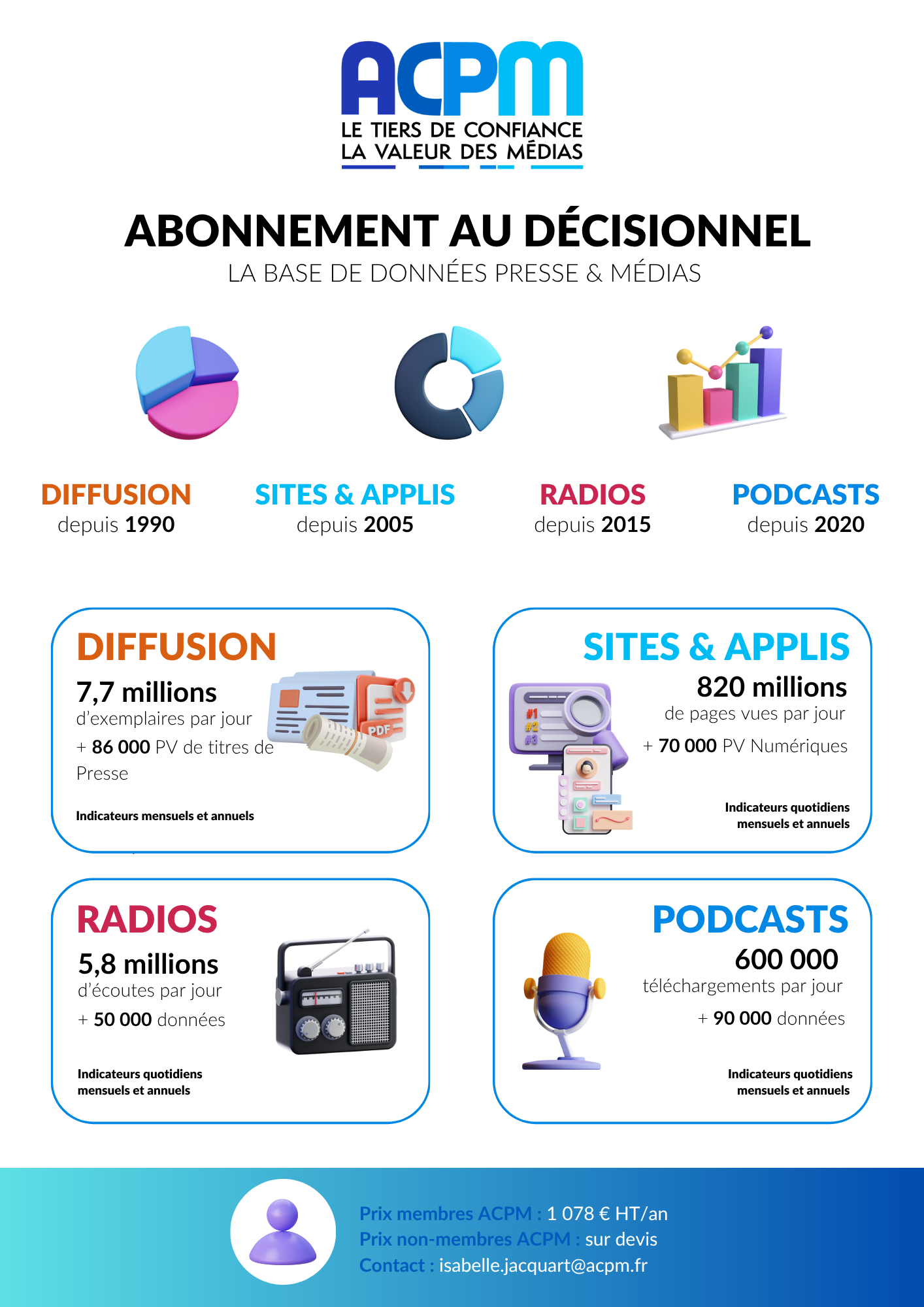 L’ACPM a le plaisir de vous informer que dès à présent les données Radios (historique depuis juin 2015) et Podcasts (historique depuis juin 2020) sont intégrées dans le Décisionnel. La granularité de ces données est plus fine que sur les communications mensuelles, à savoir quotidienne.