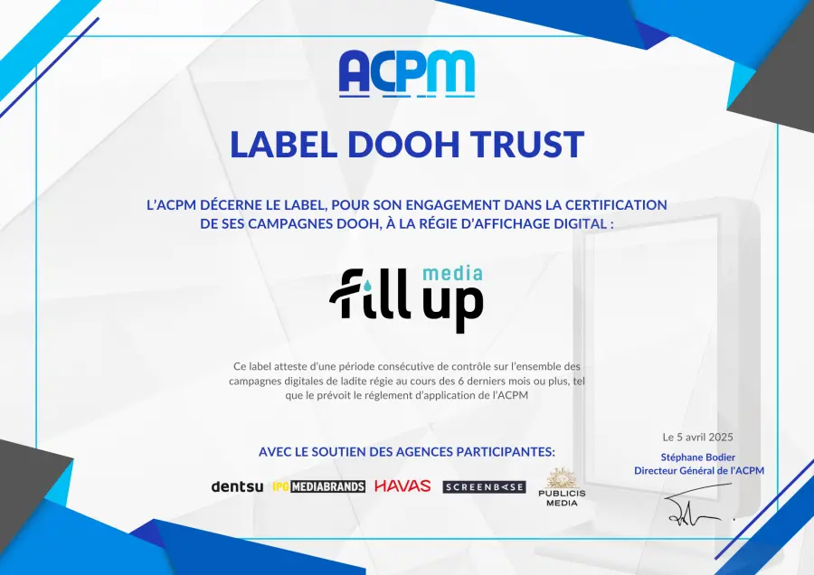 La régie Fill Up Media a obtenu le label « DOOH Trust » délivré par l’ACPM, récompensant la transparence de la diffusion de ses campagnes publicitaires en DOOH (Digital Out-Of-Home).