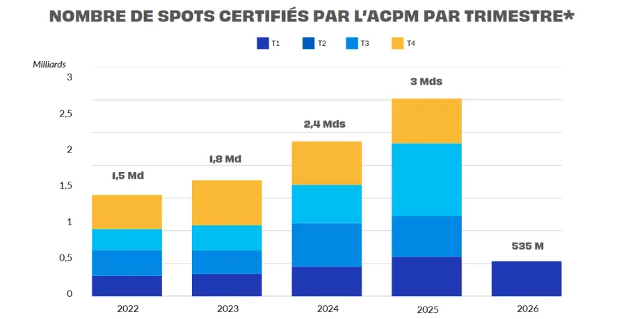 Au premier trimestre 2026, l’ACPM a certifié 306 campagnes DOOH, représentant 535 millions de spots certifiés, soit 1,7 million de spots en moyenne par campagne.
